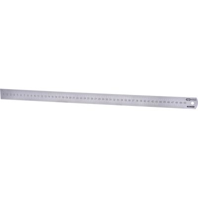 Pólelastyczny przymiar stalowy, 500mm na haku•górna krawędź 1 mm•dolna krawędź 1 mm•z dużymi liczbami dziesiętnymi•jednostki grawerowane•podziałka skali w kolorze czarnym•matowany - nieodblaskowy•zaokrąglone krawędzie•precyzyjność pomiaru zgodna z klasą dokładności WE II•nierdzewna•walcowana stal sprężynowa