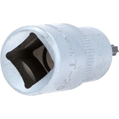 Gniazdo bitów dla srub Torx z otworem czol TB20, 1/2"•Torx z otworem czołowym•wewnętrzna nakładka czterokątna zgodna z DIN 3120 / ISO1174 z blokadą kulkową•z wciskanym, niklowanym wkładem bitowym•do obsługi ręcznej•mat satynowany•chrom-wanad