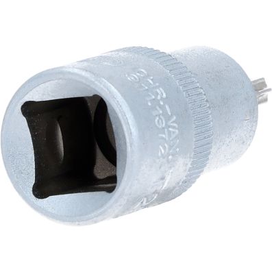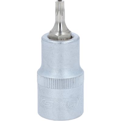 Gniazdo bitów dla srub Torx z otworem czol TB25, 1/2"•Torx z otworem czołowym•wewnętrzna nakładka czterokątna zgodna z DIN 3120 / ISO1174 z blokadą kulkową•z wciskanym, niklowanym wkładem bitowym•do obsługi ręcznej•mat satynowany•chrom-wanad