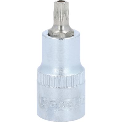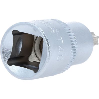 Gniazdo bitów dla srub Torx z otworem czol TB40, 1/2"•Torx z otworem czołowym•wewnętrzna nakładka czterokątna zgodna z DIN 3120 / ISO1174 z blokadą kulkową•z wciskanym, niklowanym wkładem bitowym•do obsługi ręcznej•mat satynowany•chrom-wanad
