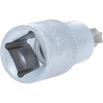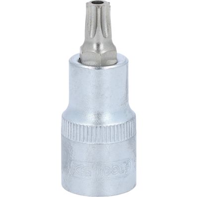 Gniazdo bitów dla srub Torx z otworem czol TB45, 1/2"•Torx z otworem czołowym•wewnętrzna nakładka czterokątna zgodna z DIN 3120 / ISO1174 z blokadą kulkową•z wciskanym, niklowanym wkładem bitowym•do obsługi ręcznej•mat satynowany•chrom-wanad