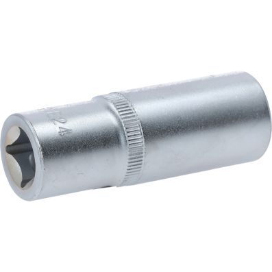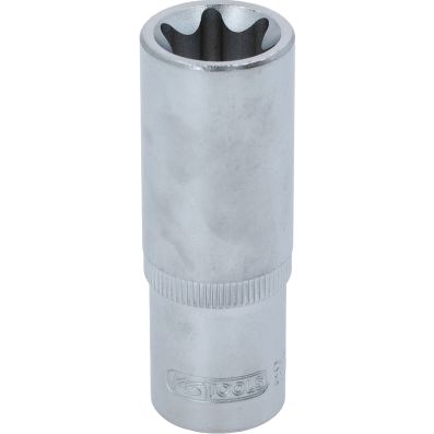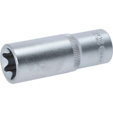 Gniazdo Torx-E, dlugie, E24, 1/2"•Torx-E•wewnętrzna nakładka czterokątna zgodna z DIN 3120 / ISO1174 z blokadą kulkową•model długi•do obsługi ręcznej•mat satynowany•chrom-wanad
